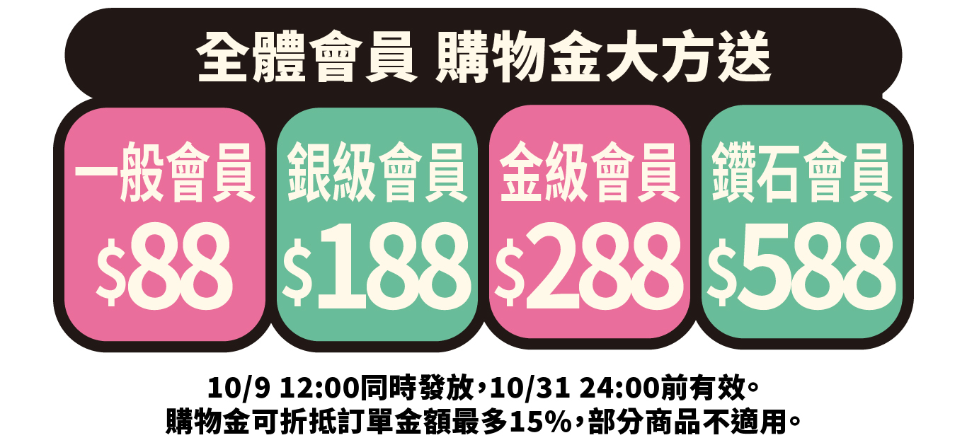 全體會員的購物金已經於10月9日發送完畢,依照會員等級發送。本活動購物金有效期至10/31 24:00前有效,可折抵訂單金額最高15%。部分商品不適用(備註A)。