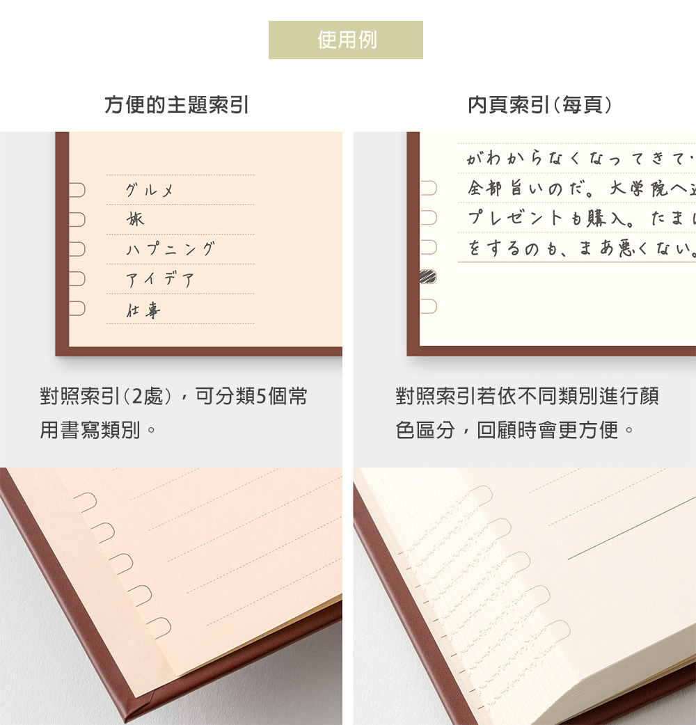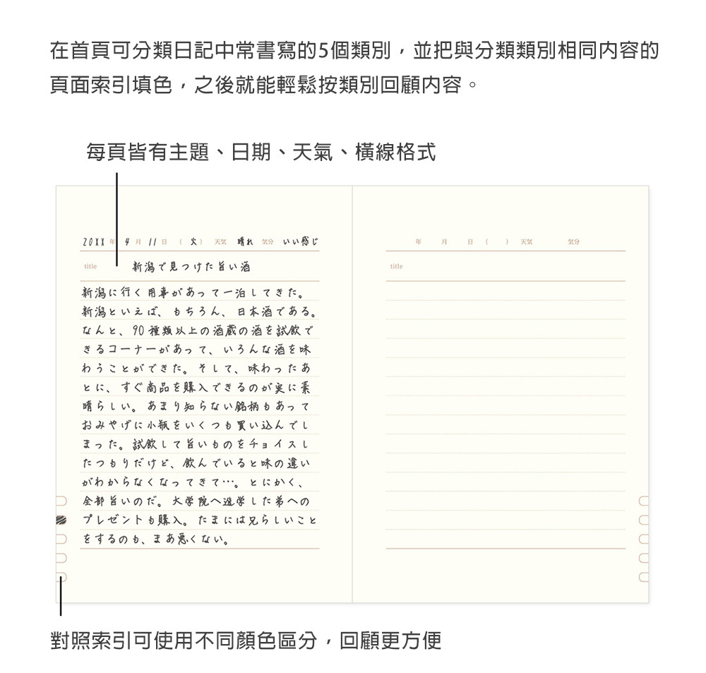 包含可以規劃使用的5個分類索引標記。書寫後可以將日記內容分類,塗上顏色後就分類完成,方便日後回顧。