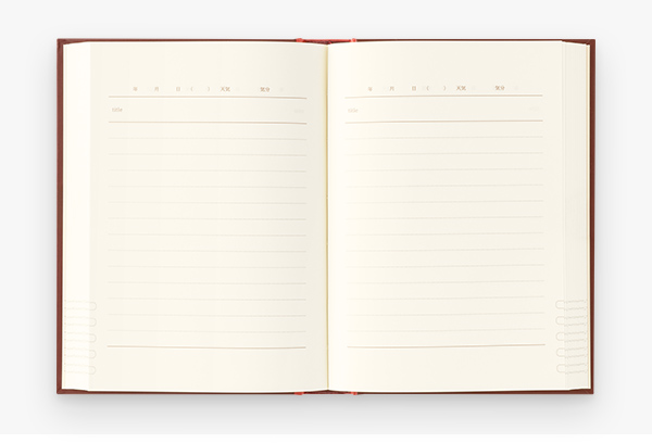 以1日1頁格式為主的日記本,包含一個堅固的封套,可以妥善的保存日記本。日記本的外觀就像是一本西洋書籍,典雅又精緻的封面設計。內頁採用MD Paper,書寫不易透頁、暈染,提供高品質的書寫體驗。裝訂是堅固耐用的線裝,經常翻閱也不易損壞。