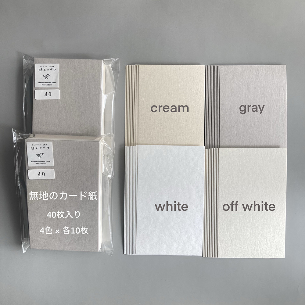 包含4種顏色的空白名片手作、印章專用卡片:白色、米白、奶油、淺灰,各色10張,共40張。日本製造。