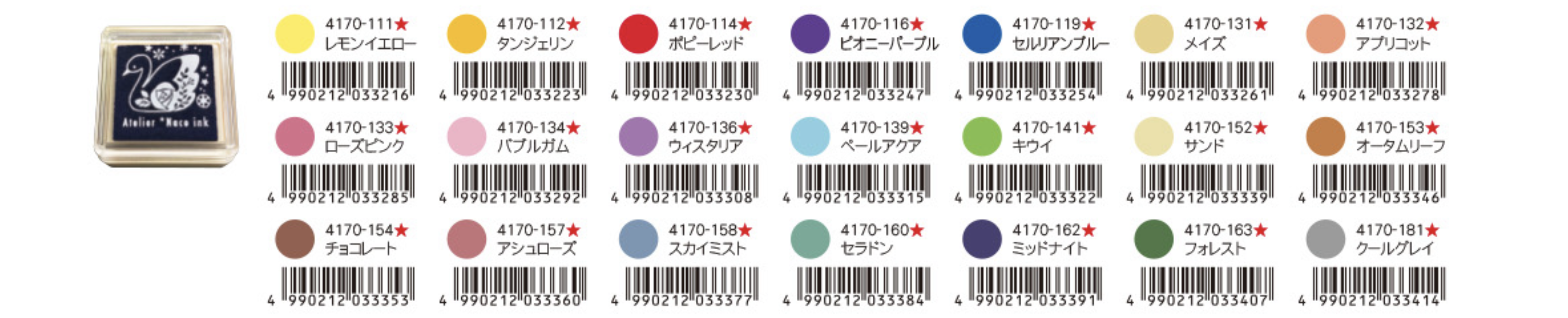 包裝尺寸約為35x35x20mm,印台面尺寸約為25x25mm,印台面為海綿材質,水性顏料系,顏色鮮豔飽和,可搭配浮雕粉使用。全21色。是田口奈津子老師與Kodomo no kao合作推出的超美印台。