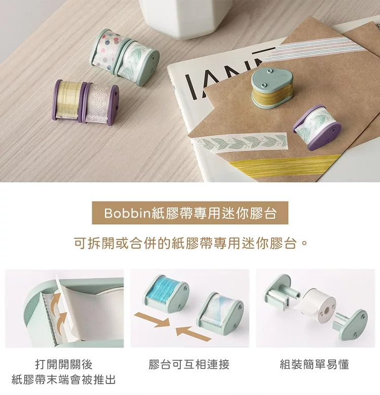 僅可使用於Bobbin分裝之軸芯或另受的紙膠帶組合。本款包含3個迷你膠台。便利撕貼設計,刀片下方輕推,即可繼續撕貼下一段。
