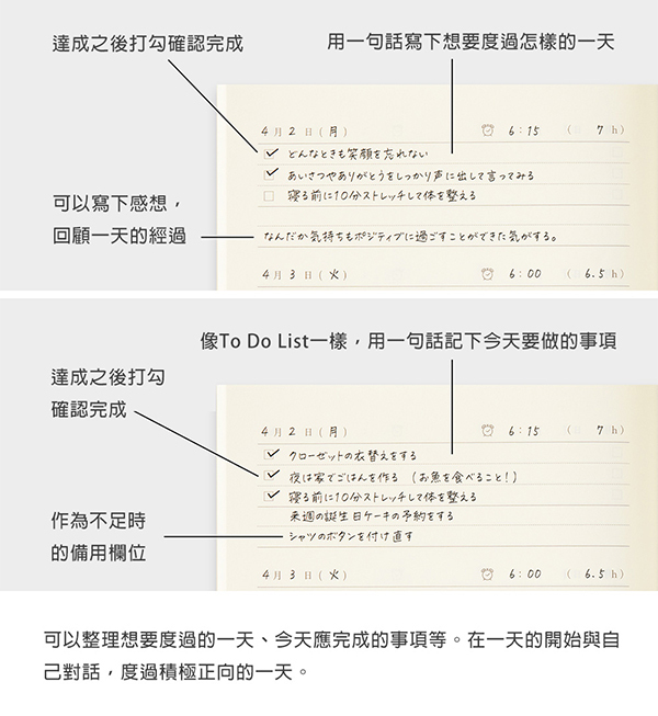 內頁的主要格式就像是一份待辦清單,你可以勾選已完成的事項。最後兩行可以當作備用的空間,也可以用來總結當天的回顧。