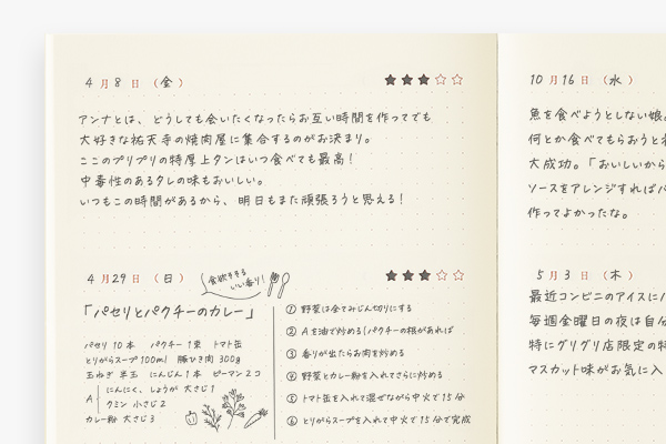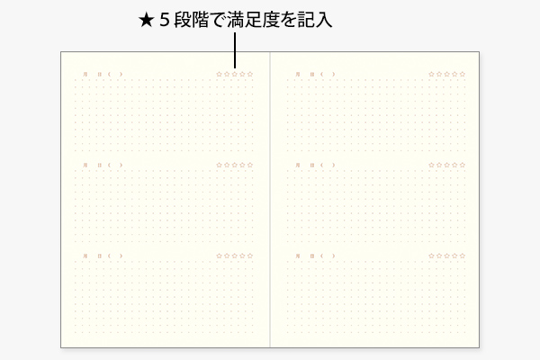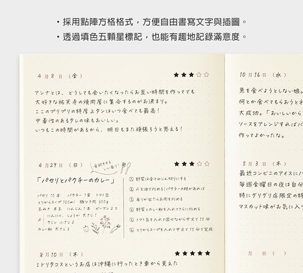 內頁的主要格式是點陣方格,除了書寫外更方便用來繪圖。每天都有5個星星可以評分,記錄起來很有樂趣唷!
