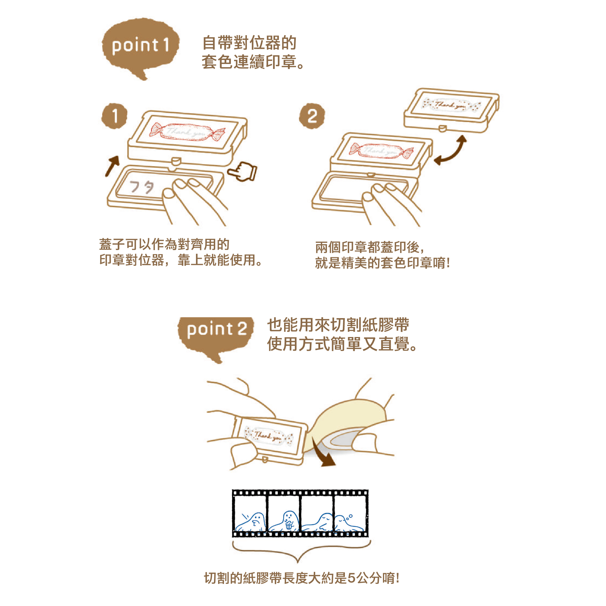 包含兩種顏色的套色印章一組,同時也能當作紙膠帶切割器使用。印章尺寸約48x25mm,實際蓋印圖案尺寸約33x12mm。印章大約可以蓋印1000次,無法補充墨水。包裝尺寸約120x70x13mm。日本KUTSUWA出品,中國製。
