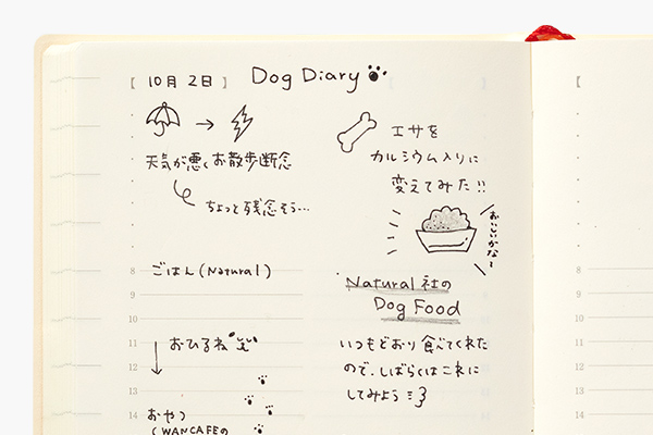 <自由日記頁>包含左側的點點和橫線區域,可以按照時間依序寫下從早上八點到午夜的行程。