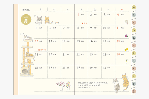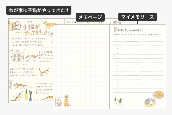 | 内容 | 全年月曆、全年行事曆、 月行事曆(2026年1月~2027年3月※15個月)、 附錄:小貓來了我們家 2頁 方格Memo(9頁/5mm方格)、 My Memories、個人資訊 ※刪減了地鐵圖,新增了My Memories頁面,讓你可以寫下一年中的回憶和難忘的時刻。 |