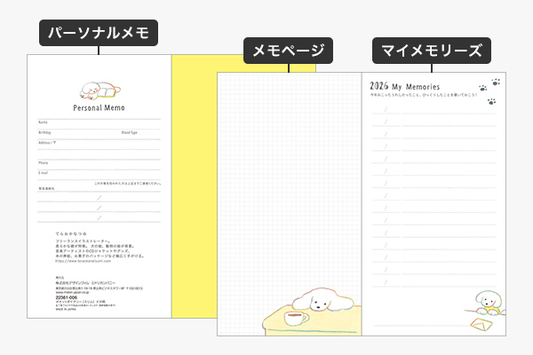 | 内容 | 全年月曆、全年行事曆、 月行事曆(2026年1月~2027年3月※15個月)、 方格Memo(9頁/5mm方格)、 My Memories、個人資訊 ※刪減了地鐵圖,新增了My Memories頁面,讓你可以寫下一年中的回憶和難忘的時刻。 |