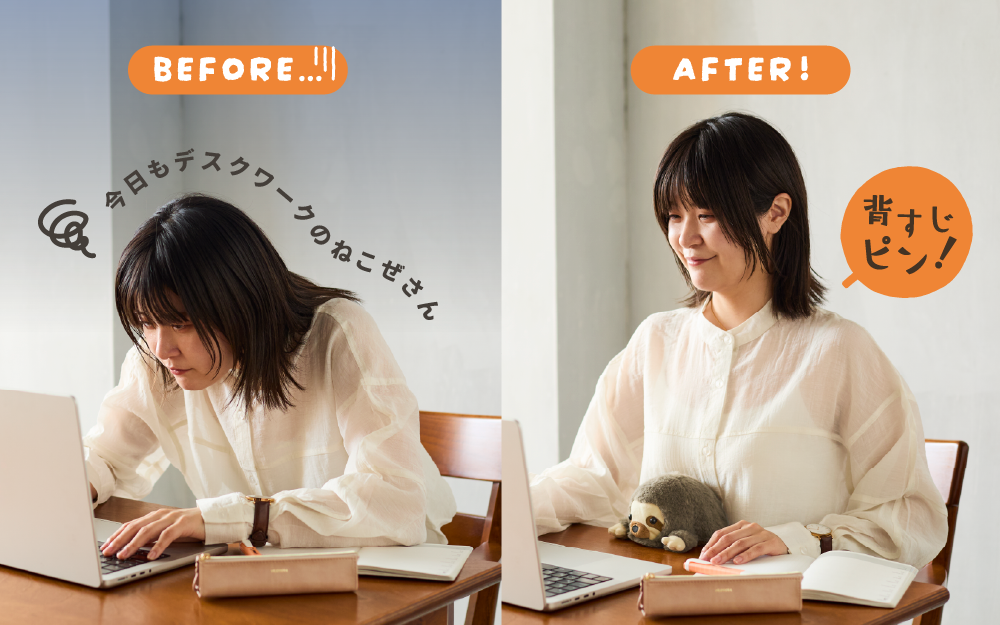 「坐姿伴偶」是一群為了不讓自己從桌子上掉下來而努力的可愛動物們。透過夾在桌子和你的肚子之間,這個可愛的絨毛玩具可以幫助你保持良好的坐姿。儘管這些可愛動物們本身也有駝背的情況,但他們絕對會全心全意的為你努力加油打氣!就讓這些模樣可愛又療癒的「坐姿伴偶」來支持你工作或學習吧。