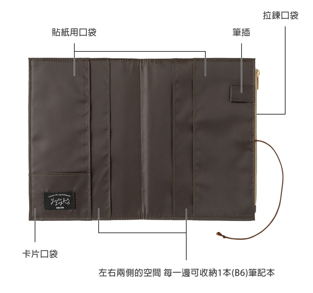 左右兩邊的口袋可以分別收納你最愛的Yuru Log筆記本,非常適合喜歡將不同用途或主題分開紀錄的使用者,當然你也可以用來當作收納其他小物品的口袋使用♪